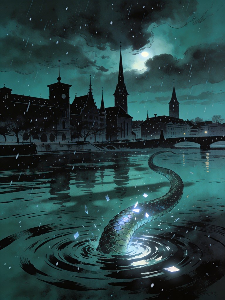 Between these calls, myths slip in the cracks—tales from the cleaning woman, who swears her great-uncle once saw a frost giant striding down the Limmat on Christmas Eve, blue as glacier melt. She tells me of Frau Perchta and the Wild Hunt, of the Tatzelwurm burrowing beneath Uetliberg, of lost spirits haunting the lake if you listen near midnight. Each story lands in me like algebra, not quite solved—a reminder that not everything can be catalogued, not even my own heart.