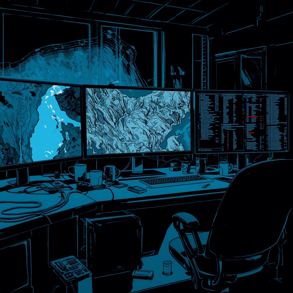 The command centre is flooded with blue light and sleep deprivation. Tarmo stands above three monitors—one cycling through riverbank thermal images, another frozen on a grainy satellite view of the Carpathians, a third pulsing with encrypted alerts from half a dozen agencies. His broad, pale face—so often unreadable—now bears twin crescents of exhaustion beneath his eyes.