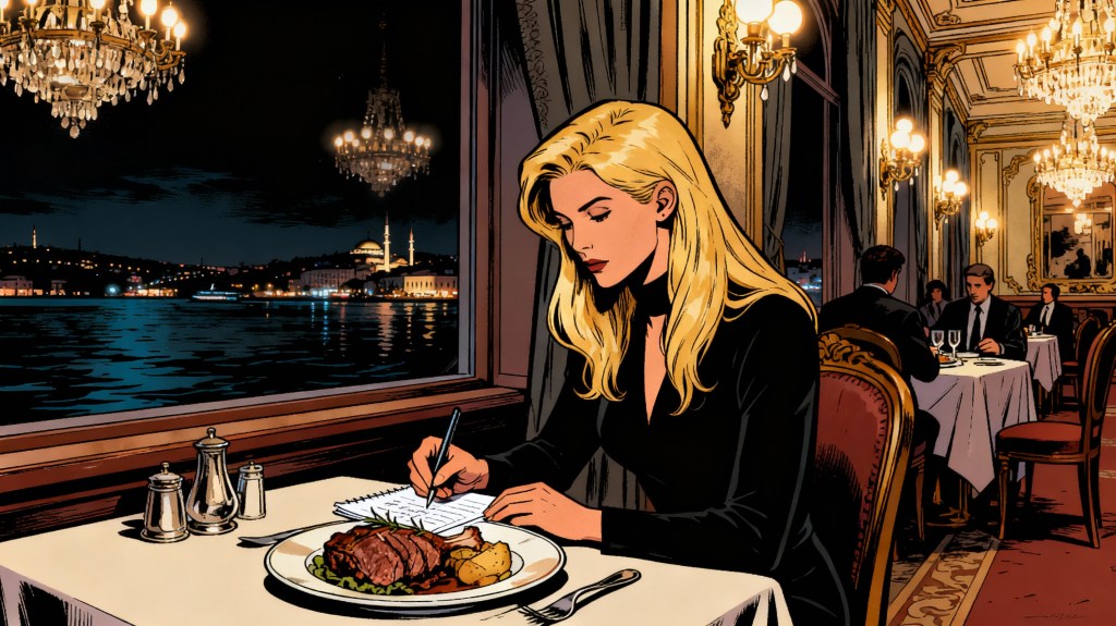 A confession: for this Istanbul chapter, I pitted two AI image generators against each other in a graphic novel cage match. The first, channeling Mazzucchelli/Miller noir, gave me Elena in shadows—alert, unseduced, very much her own narrator in a city of secrets.