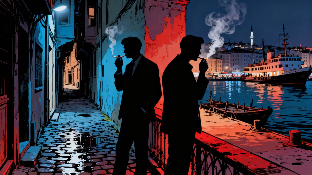 Night glazes the cobblestones in Karaköy, rain slicking the stones beneath the thrumming glare of fish market lights. He moves like rain is nothing: face lost in the crowd, another shadow among dockworkers and traders. No one notices unless he wishes it.