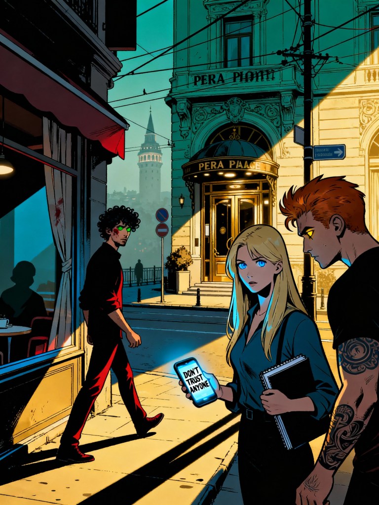 The city throbs—Galata Tower rising in the distance, tram bells echoing up Istiklal, Istanbul’s pulse caught between old stones and modern threat.