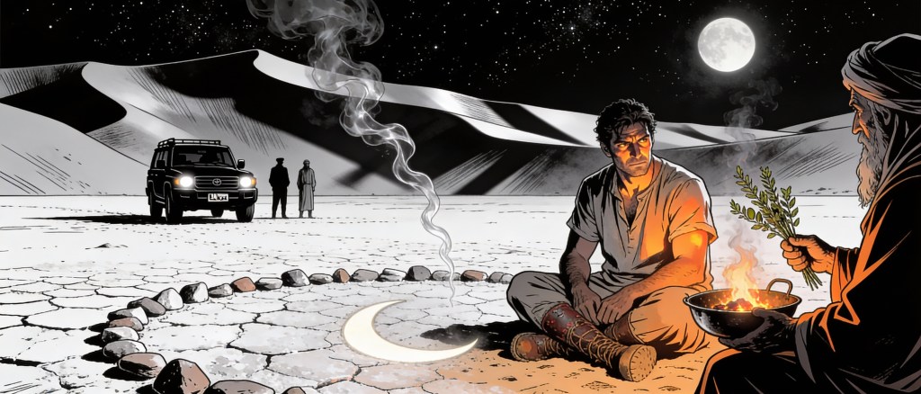 Walls beyond: desert silence pure. Reza pushed farther, Cruiser pitched sand-headlights-killed. Star-draped: shaman—undyed robe, haoma sprigs, iron bowl, rue-fire.