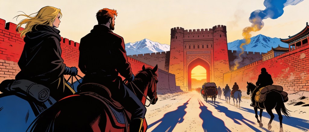 I kept pace beside Asdar. Here, in the open press of humanity, we were just travellers—no lingering gazes, no private murmurs—and yet the memory of the border morning was still there, tucked between us in the saddle-space like a folded letter no one dared open in public.