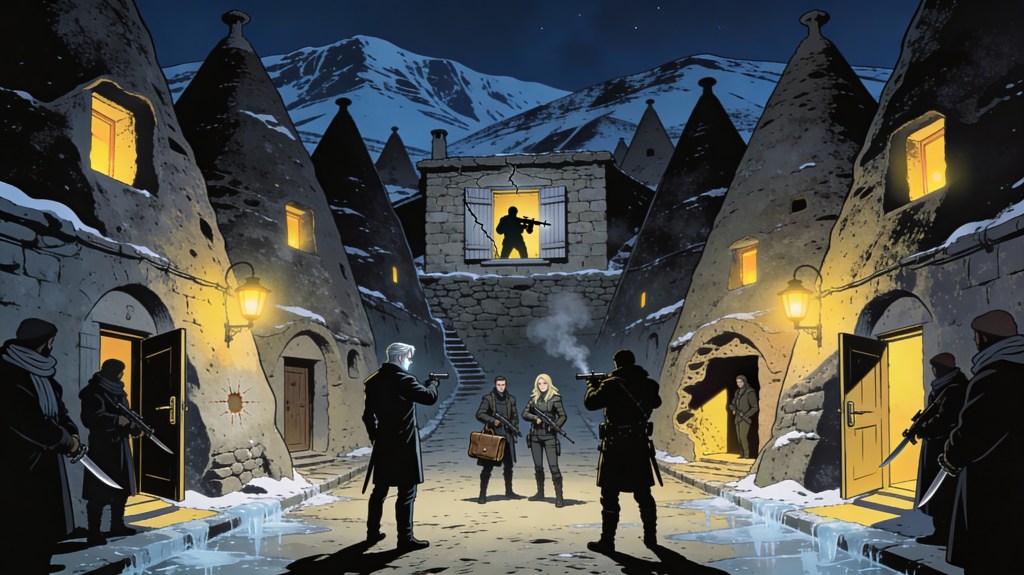 Snowmelt dripped from stone eaves, each drop loud in the silence. The main street of Kandovan was no more than a rib of packed earth between rock-hewn houses, lit by scattered yellow lamps. The whole village seemed to listen as strangers’ boots sounded on its spine.