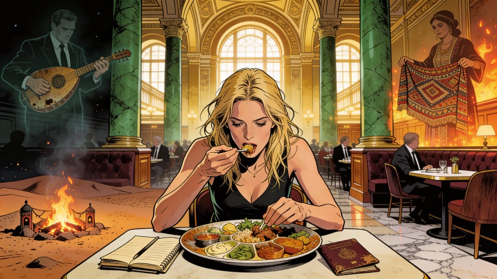 I feel oddly invisible, grateful for the anonymity. Known to no one here, just another guest refuelling before heading back to the brittle work of untangling diaspora. The contrast isn’t lost on me—Asdar’s breakfast insistence, the Romani girl’s drum, the circled faces in firelight, and now this: alone in a temple to capital, overfed and still somehow displaced.