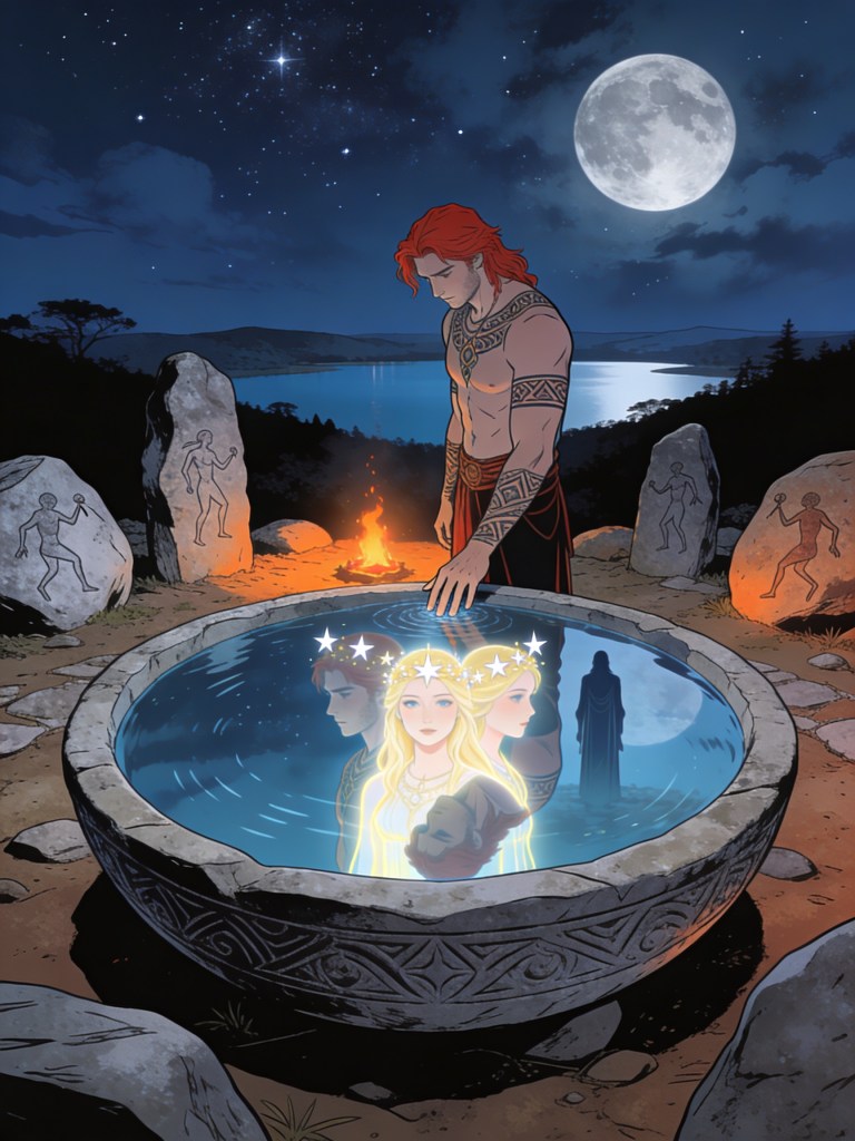And for an instant that lasted forever, all three of their faces appeared in the water’s mirror—his, Elena’s, and Tarmo’s—entwined as myth and starlight, past and future converging in the eternal now.