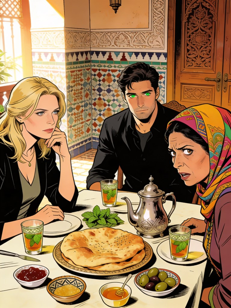 The table is set with mint tea, bread still warm, and olives in their tiny dish. Karim sits quietly opposite, hands folded, but his gaze marks me with the patience of someone who sees more than he reveals.