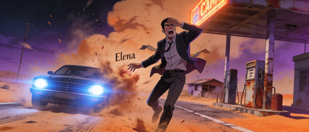 He gives a distracted smirk. But then, without warning, the storm hits. The sky collapses into shrieking ochre, wind driving clouds of sand so thick the world shrinks to the arc of headlights and the rattle of grit against steel. Blinded and desperate, we stumble on a battered gasoline station—a battered sign flickering weakly above rusted pumps, its shack warped and battered by old storms.