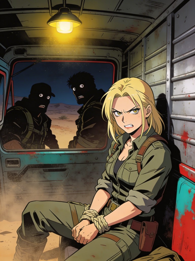 Far away—I don’t know how far—I regained my senses in a rattling, musty vehicle. My eyes stung; my wrists were bound in front with a rough cloth.