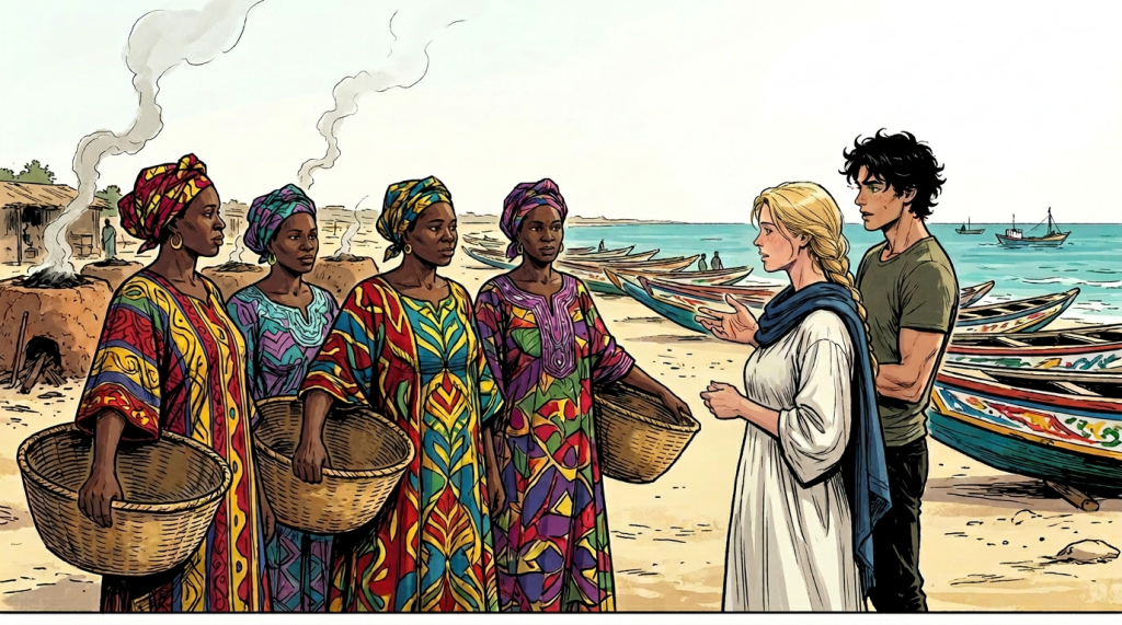 “We’ll need to find a way south — maybe another boat, maybe a bush taxi to Dakar,” he says quietly. “But for now, we should rest.”