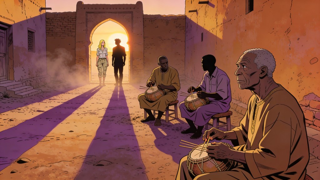 The city is chaos—market cries, motorbike horns, spices sharp as jealousy. We duck into a courtyard where three men with koras pluck the dusk like strings of silk. One pauses mid-note, eyes twinkling.