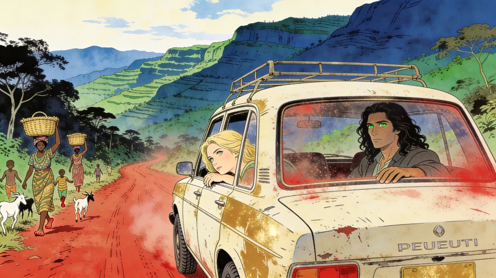 A driver leans against his battered Peugeot. I study the cracked windshield and arch an eyebrow. “Do you think it’ll make it up the mountains, or shall we push when the engine gets bored of the incline?”