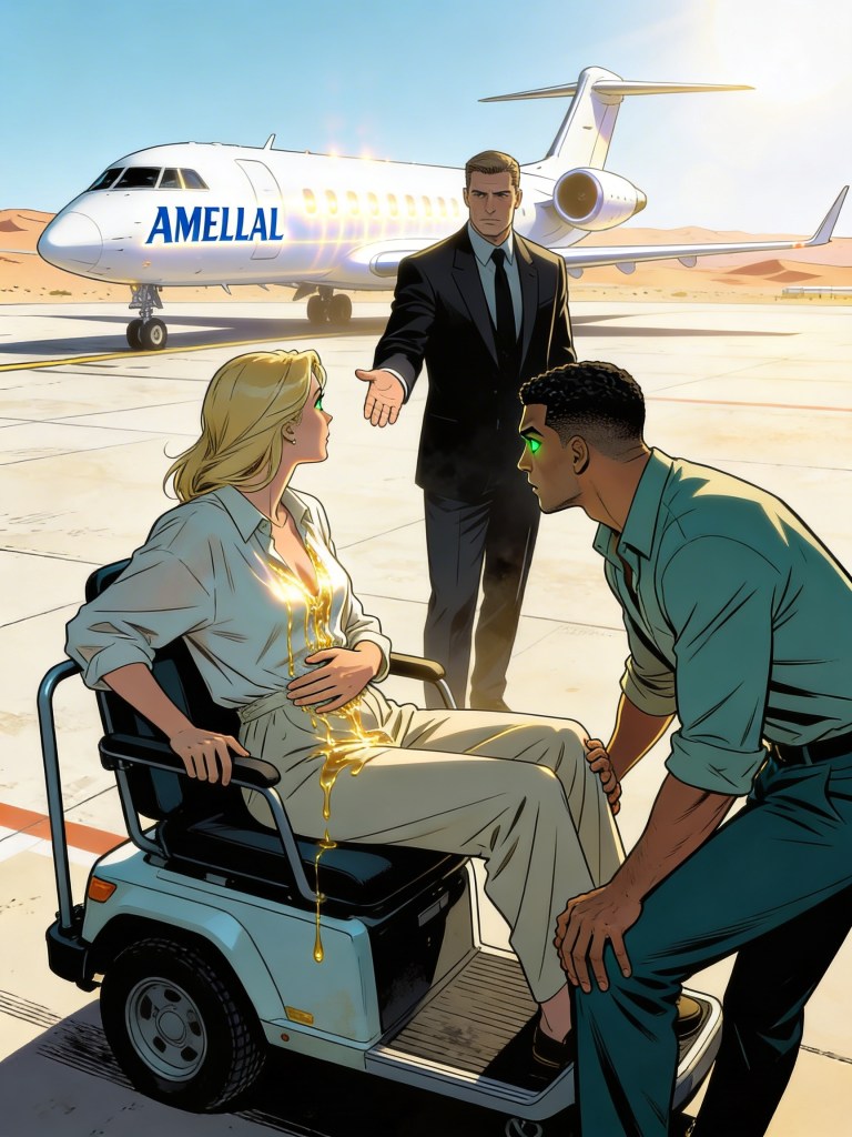 I gasp, staring down as rivulets of golden liquid seep across my blouse, glimmering like threads of fire beneath the pitiless sun.